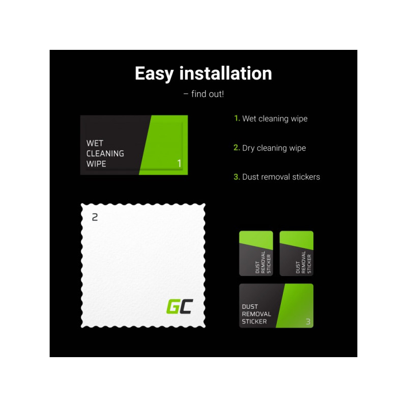 - Curățați bine ecranul cu șervețelul de curățare umed numărul 1 (verde). La lumină, asigurați-vă că ați îndepărtat toate particulele de praf.